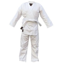 Klasické biele kimono na karate vyniká svojou trvanlivosťou a odolnosťou voči poškodeniu. Oblečenie je vyrobené zo 100 % bavlny a má tradičný, univerzálny strih. Mikina má vystužený golier, nohavice majú všitú gumu a šnúrku, ktorá zaručuje pohodlné a dokonalé prispôsobenie. Súčasťou súpravy je aj biely opasok.