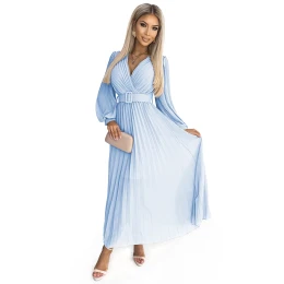 Klara - plisované šifonové dámské šaty s výstřihem, dlouhými rukávy a opaskem.