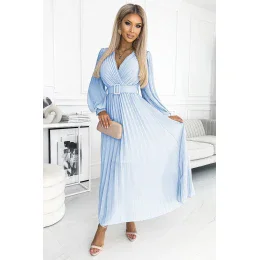 414-10 KLARA plisované šaty s opaskom a výstrihom - MODRÉ