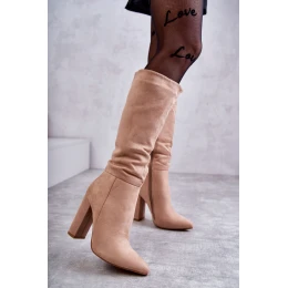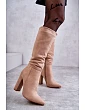 Klasyczne Zamszowe Kozaki Na Obcasie Ciemnobeżowe Tressa