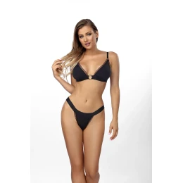 Zvodný kúsok v čiernej farbe, v ktorom sa budete cítiť ako v sexi bikinách. Skvele bude vyzerať aj ako súčasť jarného/letného outfitu. Model je doplnený širšími, plochými, elastickými gumičkami a jemným nariaseným tylovým lemom. Mäkké košíčky so strieborným kruhom, tangá opticky predlžujú nohy. Zloženie: 90% polyamid, 10% elastan.