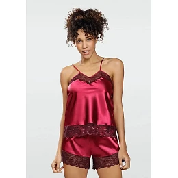 Košieľka pyžamá má úzke ramienka, ktorých dĺžku je možné nastaviť. Výstrih zdobí efektné čipka s kvetinovým motívom. Krátke nohavice majú voľný strih. Nohavice sú olemovné čipkou.