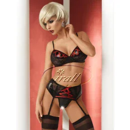 Zmyselný trojdielny komplet v čierno-červenej farbe, vyrobený z kombinácie sexi, mierne lesklej tkaniny Wet-Look a priehľadnej kvetinovej čipky. Otvorené tangá. Skvelý podväzkový pás - zvýrazňuje boky a upúta pozornosť červenou stuhou, ktorá podnecuje predstavivosť. Nastaviteľné podväzkové pásy. Vysoká kvalita. Výrobok balený v krabici výrobcu. Zloženie: 49 % polyester, 36 % polyamid, 15 % elastan.