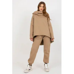 Dámska súprava pozostávajúca z mikiny a nohavíc. Blúzka s dlhými rukávmi a kapucňou. Dlhé nohavice so zaväzovaním v páse a vreckami.