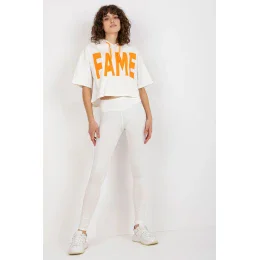 Mikinový set pozostávajúci z mikiny a legín. Voľná mikina s krátkymi rukávmi a kapucňou. Dlhé legíny so širokým elastickým pásom. Set s ozdobným nápisom.