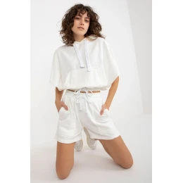 Mikinový set pozostávajúci z blúzky a šortiek. Blúzka s krátkymi širokými rukávmi, kapucňou a klokaním vreckom. Šortky so zaväzovaním v páse a vreckami.