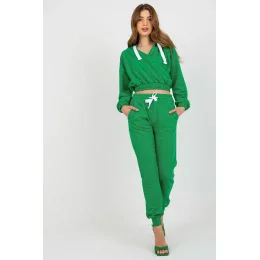 Mikinový set pozostávajúci z mikiny a nohavíc. Krátka mikina s dlhými rukávmi, kapucňou a zavinovacím výstrihom. Dlhé nohavice so zaväzovaním v páse a nápletovými vreckami.