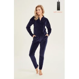 Dámska tepláková súprava z hrejivého velúru. Blúzka s dlhými rukávmi, stojatým golierom a výrazným rozparkom v tvare písmena V. Dlhé nohavice s praktickými vreckami na bokoch, pohodlná guma v páse. Ideálne ako športové oblečenie alebo súčasť každodenného oblečenia. Tepláková súprava je ľahká, priedušná a zároveň hrejivá.