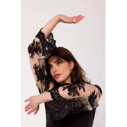 95% polyester 5% elastan 100% polyester(guipure) PODROBNOSTI O PRODUKTU: tkaný materiál klasické šaty s širokými guipure rukávy výstřih s posádkou skrytý zip na zádech bez podšívky Naše modelka je 168 cm vysoká a nosí velikost S Navrženo a vyrobeno v Polsku