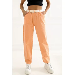 Dámske nohavice zo šnurovacej tkaniny s módnym mrkvovým strihom, ideálne na každý deň. Sú vyrobené z vysokokvalitnej bavlnenej zmesi s prídavkom elastanu, zaručujú pohodlie, pružnosť a dobre sa prispôsobia postave. Model s vysokým pásom a vloženým elastickým pásom zaručuje pohodlné nosenie, zatiaľ čo dodatočný zapínací pás zvýrazňuje pás a dodáva štýlový nádych. Zúžené nohavice s dĺžkou 7/8 dodávajú celkovému vzhľadu moderný charakter a opticky predlžujú nohy. Nohavice v jednofarebnom vzore s praktickými bočnými vreckami kombinujú funkčnosť s minimalistickou estetikou. bavlna 98 %