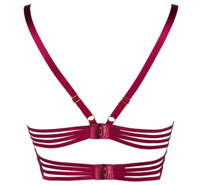 Tato koketní a efektně střižená měkká polokorzetová podprsenka je "must have" ve vašem šatníku. Překvapivé kombinace a střih naší vínové krajky jsou novinkou na trhu. Díky speciálně střiženým špičkám budou vaše tělo zdobit nejmódnější vzory letošního léta. Má dvojité zapínání na dva háčky a neodnímatelná, ale nastavitelná ramínka zakončená zlacenými ornamenty.