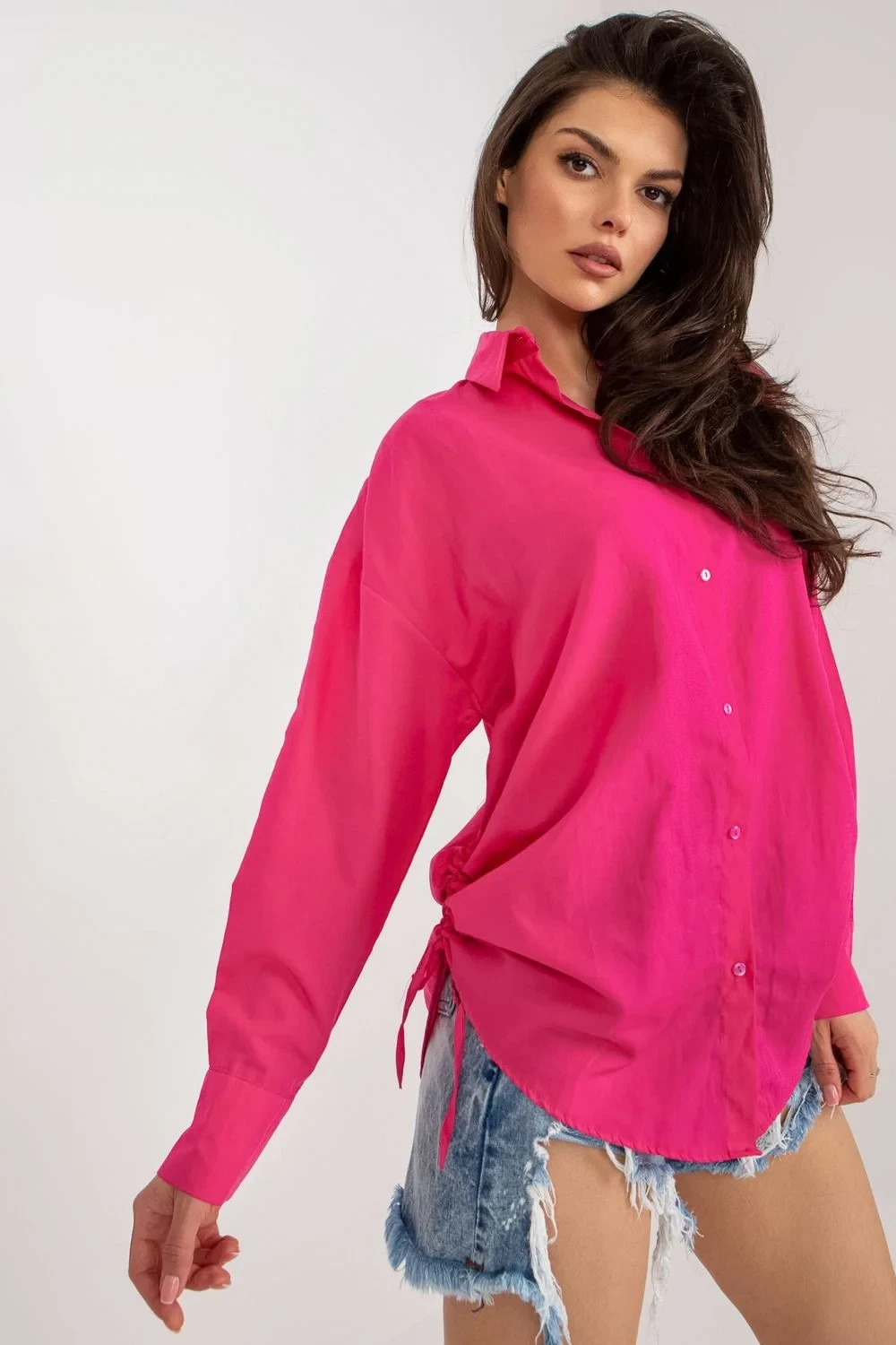 Dámska košeľa voľného strihu s dlhými rukávmi, zapínanie na gombíky. Rebrovanie na bokoch košele. Bavlna 65%