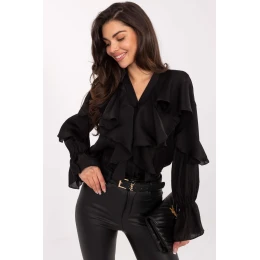 Klasická dámska košeľa v elegantnom štýle, ktorá je ideálna na každý deň, do práce aj na spoločenské udalosti. Je vyrobená z kombinácie lyocellu a polyesteru a spája v sebe pohodlie, ľahkosť a odolnosť. Model štandardnej dĺžky so srdiečkovým výstrihom a zapínaním na gombíky bol obohatený o efektnú zásteru a jemné volániky v prednej časti, ktoré celku dodávajú ženský, štýlový charakter. Dlhé rukávy zakončené volánom podčiarkujú eleganciu a jedinečnosť tohto dizajnu.