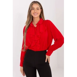 Elegantní klasická dámská košile, ideální na každý den, do práce a na společenské události. Vyrobená z vysoce kvalitního polyesteru, který zajišťuje trvanlivost, lehkost a pohodlí při nošení, a zároveň elegantní, pečlivý vzhled. Standardně dlouhý model má dlouhý rukáv s manžetou a nafouklé rukávy, které přidávají celku jemnou ženskost a módní charakter. Límec dodává košili klasický střih, a vpředu zdobí košili volán elegantním detail, který zdůrazňuje šikovný styl. Košile má zapínání na ozdobné knoflíčky, které nejen usnadňují přizpůsobení, ale také plní dekorativní funkci, obohacují minimalistický, hladký vzor materiálu. Je to nabídka pro ženy, které ocení kombinaci klasické elegance, jemných detailů a pohodlí v každodenních i společenských stylizacích.