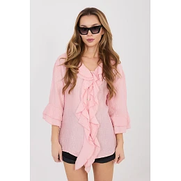 Dámská košile v boho stylu, která se skvěle hodí jak do každodenních outfitů, tak do práce. Model se vyznačuje různorodou texturou materiálu, která dává celku zajímavý a stylový charakter. Košile je vyrobena z lehkého a příjemného materiálu z kombinace viskózy a nylonu. Materiál je prodyšný, jemný k pokožce a dobře se přizpůsobuje postavě. Standardní délka umožňuje nošení košile jak zasunuté do kalhot či sukně, tak volně. Model má výstřih do srdce s knoflíkovým zapínáním a efektní límec ve formě mašle. Přední část košile zdobí dekorativní záhyb, který jí dodává romantický charakter. Dlouhé rukávy jsou zakončeny decentními volánky, co zdůrazňuje lehkost a ženský boho styl. Jedná se o jedinečný návrh pro ženy, které ocení pohodlí spojené s originálním, módním designem.