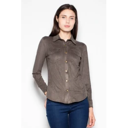 Semišová košeľa s dlhými rukávmi a kovovými gombíkmi. Model klasického strihu sa skvele hodí k priliehavým nohaviciam.