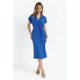 95% polyester 5% elastan DETAILY VÝROBKU: košeľové šaty z tkanej látky s golierom zavinovací vrch s krátkymi netopierími rukávmi ceruzková sukňa stredná dĺžka čiastočne elastický pás dĺžka pod kolená rozparky na chrbte nepodšitý opasok na zaväzovanie naša modelka je vysoká 176 cm a nosí veľkosť S navrhnuté a vyrobené v Poľsku