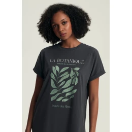 Na przodzie koszuli znajduje się designerski nadruk z motywem roślinnym i napisem „La Botanique”, który nadaje całości świeżości i kobiecego uroku. Luźny krój typu T-shirt nie krępuje ruchów i doskonale dopasowuje się do sylwetki, zapewniając pełną swobodę.