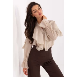 Klasická dámska košeľa v elegantnom štýle, ktorá je ideálna na každodenné nosenie, do práce aj na spoločenské udalosti. Je vyrobená z kombinácie lyocellu a polyesteru a spája v sebe pohodlie, ľahkosť a odolnosť. Model štandardnej dĺžky so srdiečkovým výstrihom so zapínaním na gombíky bol obohatený o efektný džbán a jemné volániky na prednej strane, ktoré celku dodávajú ženský a štýlový charakter. Dlhé rukávy s volánom na konci zdôrazňujú eleganciu a jedinečnosť tohto dizajnu.
