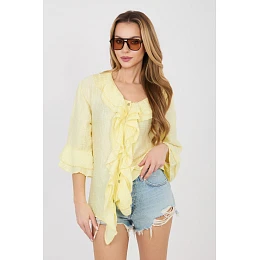 Dámská košile v boho stylu, která se skvěle hodí jak do každodenních stylizací, tak do práce. Model se vyznačuje různorodou fakturou materiálu, která dodává celku zajímavý a stylový charakter. Košile je vyrobena z lehké a příjemné látky, která kombinuje viskózu a nylon. Materiál je prodyšný, jemný k pokožce a dobře padne na postavě. Standardní délka umožňuje nosit košili jak zasunutou do kalhot nebo sukně, tak volně. Model má výstřih do tvaru V s knoflíky a efektní límeček ve formě volánku. Přední část košile zdobí dekorativní žabot, který jí dodává romantický charakter. Dlouhé rukávy jsou zakončeny jemnými volánky, co podtrhuje lehkost a ženský styl boho. Je to výjimečný návrh pro ženy, které ocení pohodlí spojené s originálním, moderním designem.