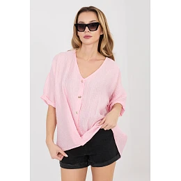 Dámska košeľa s ľahkým a pohodlným strihom, ideálna na každodennú štylizáciu. Materiál vyrobený z príjemného dotyku viskózy a nylonu je priedušný, ľahký a dobre sa prispôsobí postave. Model sa vyznačuje pestrou štruktúrou materiálu, ktorá dodáva košeli zaujímavý a štýlový charakter. Košeľa nemá golier a prestrihnutý výstrih jemne zvýrazňuje dekolt a dodáva celému kúsku ženskú ľahkosť. Krátke rukávy zase robia model ideálnym na teplejšie dni. Štandardná dĺžka umožňuje nosiť košeľu zastrčenú do nohavíc alebo sukní, prípadne voľne. Zapínanie na gombíky je praktické a uľahčuje obliekanie, pričom je klasickým zakončením.