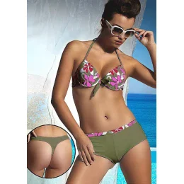 Tieto trojdielne plavky sú ideálnym spôsobom, ako stráviť dovolenku pri vode. Môžete ich nosiť ako súpravu alebo si vytvoriť vlastný komplet, a to aj s inými modelmi - súprava obsahuje podprsenku s kosticami push-up s vystuženými košíčkami, šortky a hladké tangá. Podprsenka je ideálna pre menšie poprsie - najlepšie na nich pôsobí, zväčšuje ich a zmyselne odhaľuje v dekolte. Push-up je odnímateľná, pás sa pohodlne zapína sponou na chrbte a dĺžka ramienok je nastaviteľná. Taliansky materiál, rýchloschnúci, pokrytý malebnými kvetmi. Zloženie: 80 % polyamid, 20 % elastan.