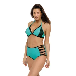 Jedny z najlepších plaviek z kolekcie Leto 2019! Krásne farby, módny strih, vysoký spodný diel a push-up podprsenka. Objednajte si ju a naplánujte si dokonalú dovolenku! Podprsenka sa pohodlne zaväzuje za krkom a na chrbte, má vystužené košíčky, ktoré sú obohatené o push-up, vďaka čomu sú prsia dokonale zhrnuté, pozdvihnuté a zväčšené (push-up výplň je prítomná v každej veľkosti plaviek a nie je z modelu vyberateľná). Dekolt je vyrobený z hladkého čierneho tylu. Na košíčkoch je vsadka z látky imitujúca zmyselnú čipku. Nohavičky sú naozajstným hitom - sú vyššie, a preto veľmi pohodlné, zakrývajú aj bruško a vďaka opaskom-gumičkám na bokoch vyzerajú stále žensky a zvodne. Talianska tkanina, krásne farby na výber. Nechajte sa zlákať, pretože to stojí za to.