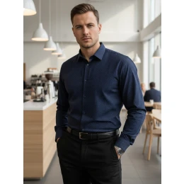 Koszula męska o kroju slim fit podkreśla sylwetkę i nadaje stylizacji nowoczesny, elegancki charakter. Wykonana z wysokiej jakości bawełny z dodatkiem elastanu, zapewnia komfort noszenia oraz swobodę ruchów przez cały dzień. Drobny, geometryczny wzór wprowadza subtelny akcent wizualny, zachowując stonowany wygląd. Starannie wykończone detale podkreślają jej uniwersalność w stylizacjach formalnych i smart casual.
