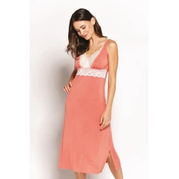 Novinka! Výrazná, hladká dlhá nočná košeľa z mäkkého, elastického úpletu, s hlbokým výstrihom štýlovo zakončeným čipkou. Mimoriadne romantická, s jemným, nežným, ženským pôvabom. Tenké ramienka, ktoré umožňujú odhalenie výstrihu a ramien. 94 % viskóza, 6 % elastan.