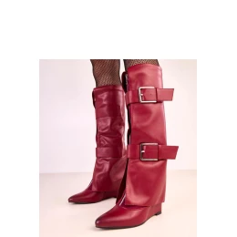 Elegantní a stylové kozačky přes koleno, které kombinují klasiku s moderním provedením. Vyrobené z vysoce kvalitní ekologické kůže, působí velmi efektně a jsou ideálním doplňkem podzimně-zimních outfitů. Model se vyznačuje otočenou šíjí a ozdobnými sponkami, které botám dodávají jedinečný charakter a zdůrazňují jejich módní vzhled. Špičatá špička přidává eleganci a opticky zjemňuje nohu, 8 cm vysoký klín zajišťuje pohodlný krok a stabilitu. Díky prošívané vnitřní části jsou boty ideální na chladnější dny, nabízejí pohodlí a teplo. Zapínání na zip usnadňuje obouvání, a 37 cm vysoká šířka se krásně přizpůsobuje noze, zdůrazňující její tvar. Jsou to klasické, vysoké kozačky, které skvěle ladí jak k šatům, tak k úzkým kalhotám, ideální pro ženy, které oceňují styl a pohodlí.