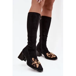 Dámske čižmy z mäkkého materiálu z ekokože. Model so zapínaním na zips poskytuje pohodlie pri nosení, stabilný blokový podpätok zaručuje komfort pri nosení. Čižmy sa vyznačujú ozdobnou mašľou so zlatým prvkom v prednej časti, ktorá im dodáva výnimočný ženský charakter. Ide o skvelú voľbu pre ženy, ktoré ocenia jemné detaily a elegantný vzhľad, ideálne k sukniam aj priliehavým nohaviciam alebo šatám.