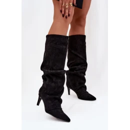 Dámské kozačky vyrobené z měkkého ekokoženého materiálu jsou elegantní a ženským návrhem na chladnější dny. Model na úzkém jehle krásně zdůrazňuje nohy, zatímco špičatá špička dodává eleganci a opticky zúžuje postavu. Skládaný, volný svršek dodává celku módní charakter. Boty se nasouvají a jsou vyztuženy koženým vložením, což zajišťuje pohodlí a tepelný komfort. Je to velmi stylový střih, který skvěle doplní jak elegantní šaty, tak i každodenní sestavy s džínami, vytvářející trendy a ženský vzhled.