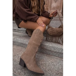 Kozačky cowboyky vyrobené z vysoce kvalitní přírodní semiše jsou ideální volbou pro ženy, které ocení spojení elegance a módního charakteru. Jejich jedinečný design inspirovaný westernovým stylem je efektním prvkem každého outfitu. Model se zasouváním a zapínáním na zip v dolní části holek usnadňuje obouvání a svlékání, zachovává přitom elegantní střih. Umístěné na stabilním, sestřiženém sloupkovém podpatku poskytují pohodlí při chůzi a zároveň jemně zeštíhlují nohy a dodávají siluetě lehkost. Špičaté špičky zdůrazňují ženský charakter obuvi a dodávají jim elegantní výraz. Vnitřek kozaček je vyztužen měkkým vlněným polstrováním, které zaručuje tepelný komfort i v chladnějších dnech. Skvěle se hodí do outfitů s šaty, sukněmi a úzkými kalhotami.