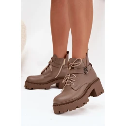 Kožené dámské kotníkové boty na klínu s ozdobným páskem zateplené model 21710528 tmavě béžové - Zazoo