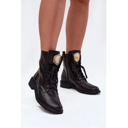 Skórzane Botki Damskie Na Płaskim Obcasie Ze Złotym Detalem Zazoo 3084 Czarne