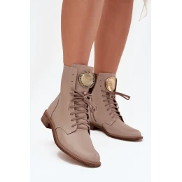 Skórzane Botki Damskie Na Płaskim Obcasie Ze Złotym Detalem Zazoo 3084 Beżowe