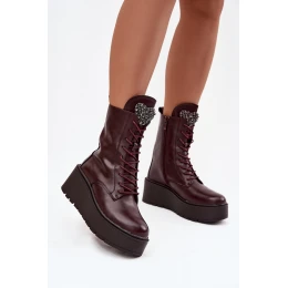 Skórzane Botki Damskie Z Ozdobą Ocieplane Bordowe Ulrika