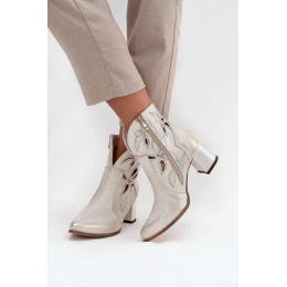 Skórzane Ażurowe Botki Damskie Na Słupku Zazoo 3647 Złoty Przecierany