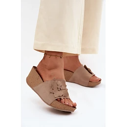 Kožené semišové dámské pantofle na platformě s ozdobným květinovým vzorem model 22125922 Cappuccino - Zazoo