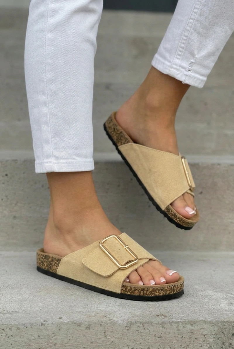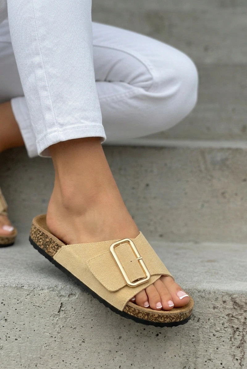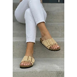 Kožené semišové dámské pantofle s přezkou Béžové Beryl