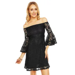 Pridanie recenzie k Čipkované dámske šaty s lodičkovým výstrihom a širokými rukávmi čierne - Čierna - MAYAADI