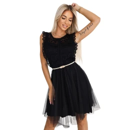 Černé krajkové šaty s tylovou spodní částí a ozdobným páskem. ženské, elegantní a ideální pro zvláštní příležitosti Numoco Basic.