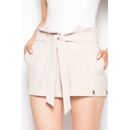 Krátke šortky s nohavicami zakončenými manžetou. Vysoký náplet s volánikovým lemom, opasok s opaskom, vrecká v bočných švoch.