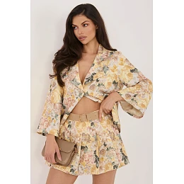 Elegantné šortkové sukne s jemnou kvetinovou potlačou, ktoré sú ideálne na pracovný styling a na návštevy. Spájajú v sebe ženský vzhľad sukne s pohodlím šortiek, čím zaručujú voľnosť pohybu a štýlový efekt. Sú vyrobené z vysokokvalitnej zmesi polyesteru a elastanu, čo zaručuje pohodlie pri nosení a dobré prispôsobenie sa postave. Široké nohavice dodávajú ľahkosť a eleganciu a krásne sa prispôsobia pri pohybe. Model má vzadu elastický pás, ktorý zvyšuje pohodlie a uľahčuje prispôsobenie. Dodatočný pás zvýrazňuje pás a je štýlovým akcentom. V prednej časti sukne sa nachádza efektné plisovanie, ktoré celku dodáva výnimočný ženský charakter.