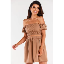 Krátka rozšírená sukňa z hladkej tkaniny s elastickým pásom, ktorý zaručuje pohodlné nosenie. Klasický strih s mierne rozšírenou spodnou časťou zvýrazňuje postavu a dodáva ľahkosť každému oblečeniu. Ideálna na každý deň aj na výnimočné príležitosti.