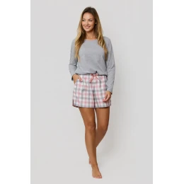Wygoda, którą poczujesz od pierwszej chwili – damska piżama w ponadczasowym stylu łączy gładką, bawełnianą koszulkę z miękkimi, kratkowymi szortami, tworząc idealny zestaw na spokojny sen i leniwe poranki. Koszulka o długim rękawie, wykonana z przyjemnej w dotyku dzianiny, gwarantuje komfort termiczny i doskonałe dopasowanie dzięki dodatkowi elastanu. Klasyczny, półokrągły dekolt sprawia, że model prezentuje się subtelnie i kobieco. Do kompletu dołączone zostały lekkie spodenki z tkaniny w delikatną kratkę, wykończone elastycznym pasem i uroczą satynową kokardką, która podkreśla ich dziewczęcy charakter. Praktyczne kieszenie po bokach dodają funkcjonalności, czyniąc piżamę idealną także do domowego relaksu.