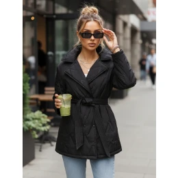 Pikowana kurtka przejściowa z paskiem w talii łączy funkcjonalność z kobiecym fasonem. Lekko ocieplana konstrukcja sprawdzi się w chłodniejsze dni wiosny i jesieni. Wiązany pasek pozwala podkreślić talię i dopasować krój do sylwetki, nadając stylizacji eleganckiego charakteru.