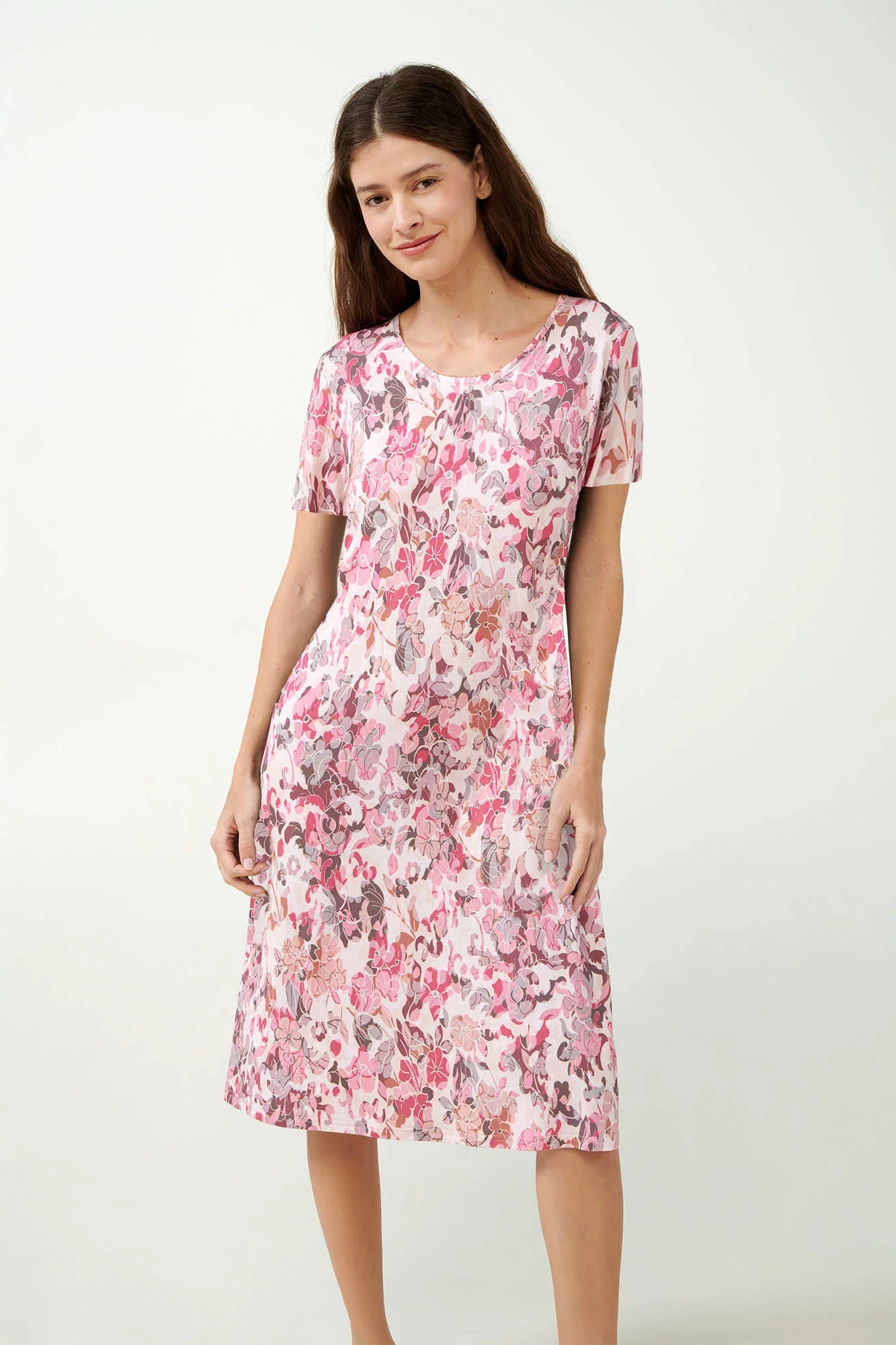 Táto kvetinová nočná košeľa v jemnej ružovej farbe v sebe spája eleganciu a pohodlie. Tkanina je vyrobená z prvotriedneho mikromodalu, ktorý je na pokožke luxusne mäkký a priedušný, takže je ideálny na pokojný spánok. Kvetinový vzor dodáva nádych ženskosti, zatiaľ čo voľný strih zaručuje ľahký pohyb a pohodlie. Táto nočná košeľa je ideálna na leňošenie alebo spánok a je krásnym doplnkom vašej zbierky nočného oblečenia.