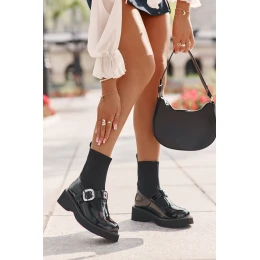 Lakovane dámské boty umístěné na nízkém, širokém podpatku a platformě. Svršek ve formě ponožky, navíc zdobený stylovým páskem s přezkou, jim dodává moderní charakter. Uvnitř vyhřívané obuvní vlnou pouze v oblasti chodidla. Ideální do městských stylizací, kombinují pohodlí s módním vzhledem. Při výběru velikosti se řiďte tabulkou velikostí.