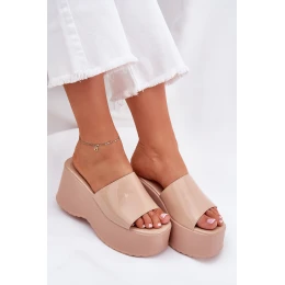 Lakierowane Klapki Damskie Na Platformie I Koturnie Beżowe Nellevia